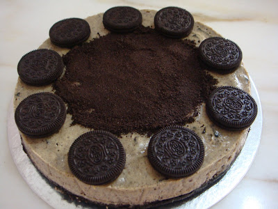 Unlike the previous attempt, I decided to tweak the filling a little and simply added some finely ground Oreo cookies to the filling, hoping to achieve a texture similiar to that of cookies and cream ice cream, cream coloured with tiny flecks of Oreo. I ended up being too generous with the addition and the cheesecake filling turned out to a greyish-brown hue.