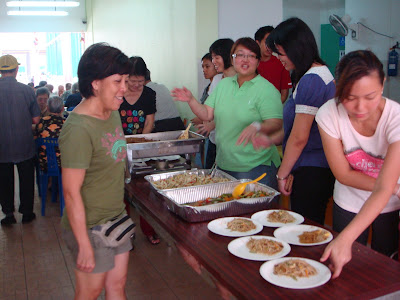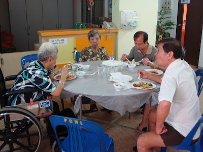 After 11am, the old folks started streaming in and in a brief moment, the whole place was bustling with activity. The old folks tucked into their lunch with joy and even had a karaoke session where they sang songs like '我问天', a hokkien number which is the theme song of '爱', a taiwanese soap opera that has high viewership in Singapore. When lunch was over, the old folks started to leave and we helped clear the place.