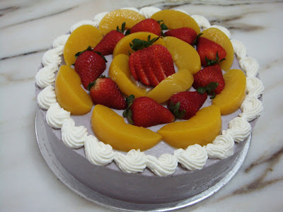 Normally, I do not have much ideas on how I want to decorate my cakes. The idea of using fruits for decoration struck my mind and I used strawberries and sliced canned peaches to fill the centre of the cake. Even though it meant spending a bit more just for the sake of decorating, the outcome is much better than I had anticipated and I do think the additional expenditure is well justified for the occasion.